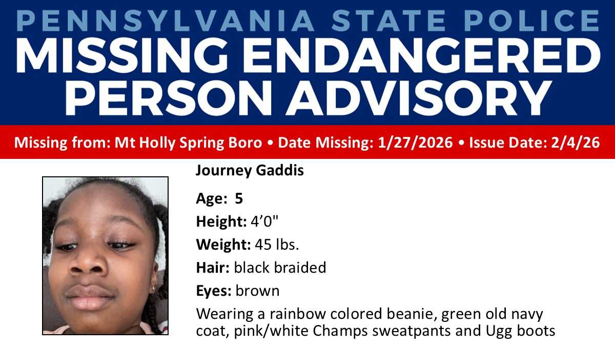 Journey was last seen in the area of the 600 block of North Baltimore Avenue in Mount Holly Springs on Jan. 27 at around 1 p.m.